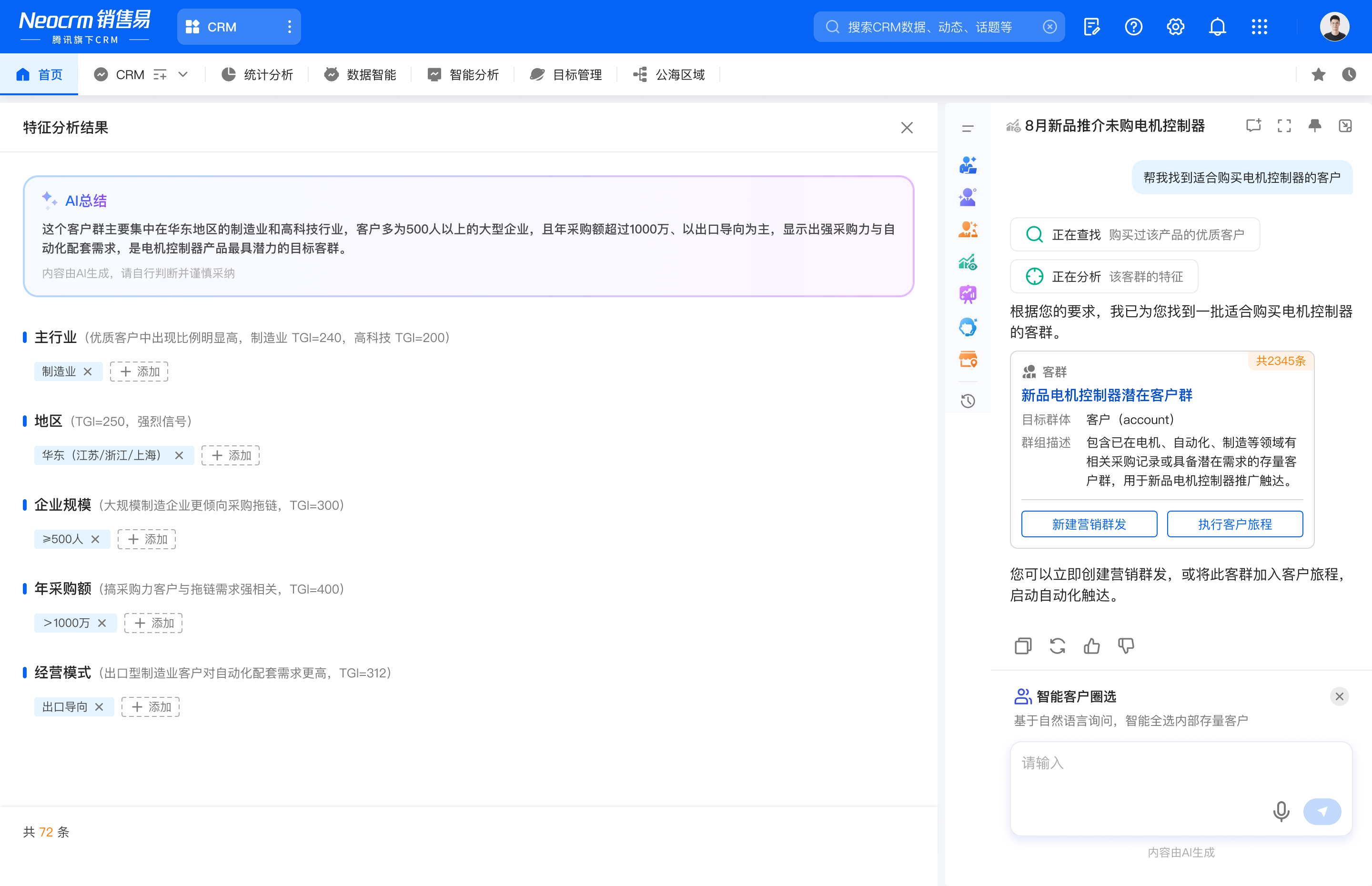 * 以客找客:AI能以您已成交的最优质客户为样本,自动在海量企业数据库中寻找具有相似特征(如行业、规模、地域)的潜客名单,直接推荐给销售,让拓客从此精准无比。