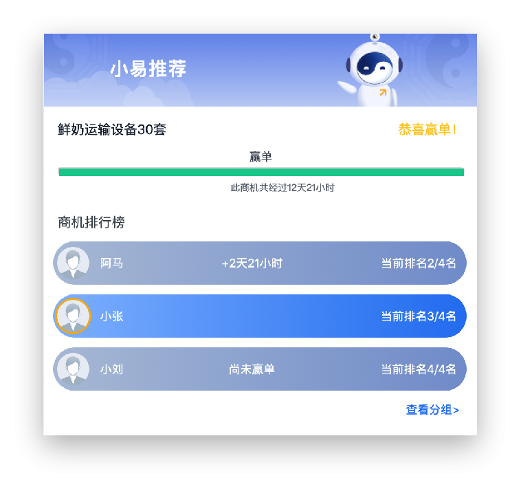 使用商机结单助手,针对重点客户,销售人员可严格管理每个商机阶段的推进时间,结合荣誉排名,激励销售行动起来赶快推进商机,直至赢单,登上“结单荣誉榜”。