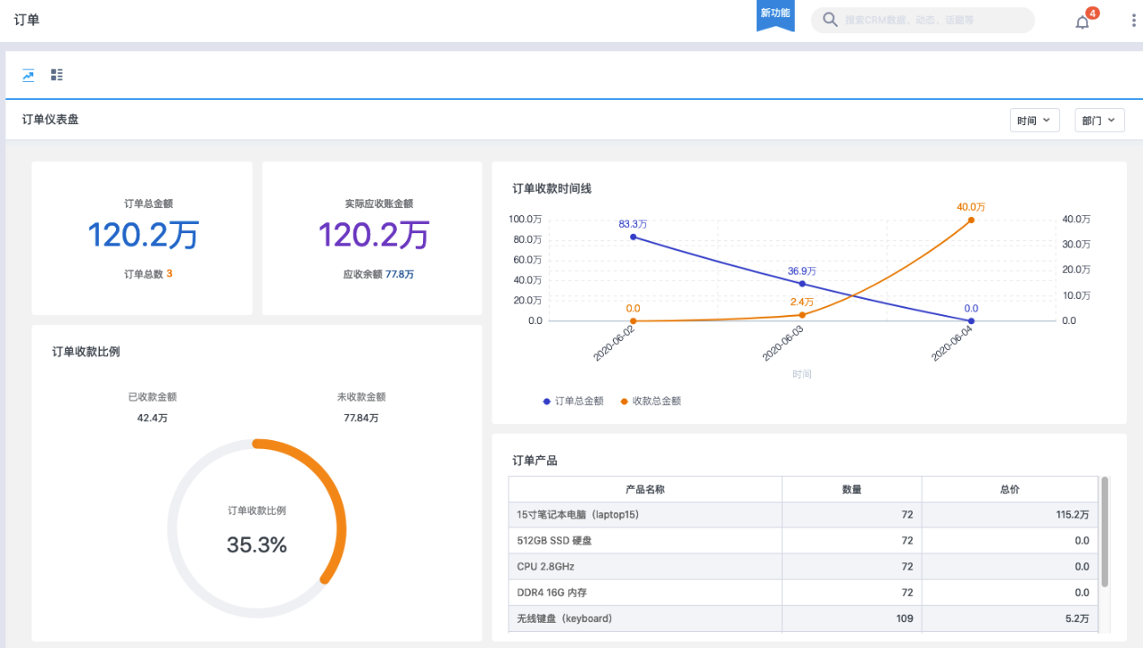 除每个实体中可添加数据看板,进行随时随地的分析,新版本还新增了列表页数据看板,方便业务人员与管理者进行更及时的数据分析、更高效的业务决策。