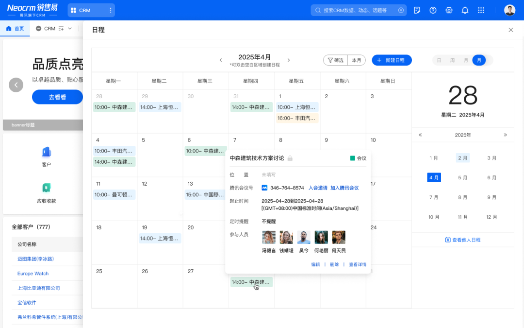 业务人员在CRM日程中创建腾讯会议、日程同步