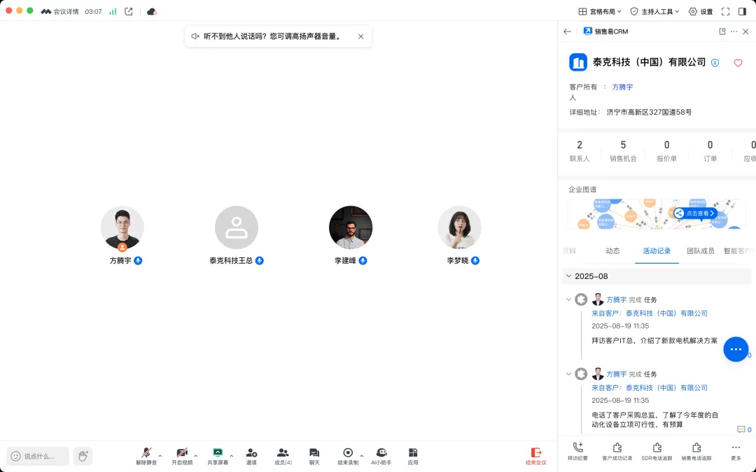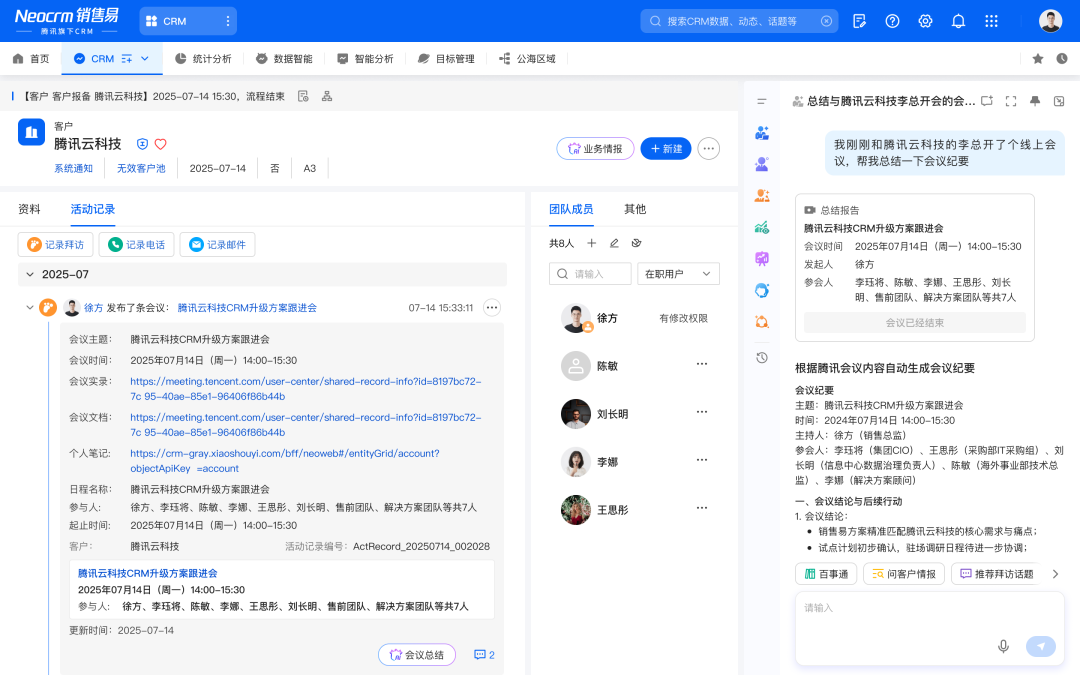 在以往线上沟通中,销售需要在会议前反复确认客户身份、手动整理参会名单;会中难以即时调取客户资料、辨识客户角色;会后还要花大量时间梳理纪要、提炼关键跟进项。信息分散、记录滞后,不仅增加了销售的事务负担,也让客户跟进的精准度和时效性大打折扣。