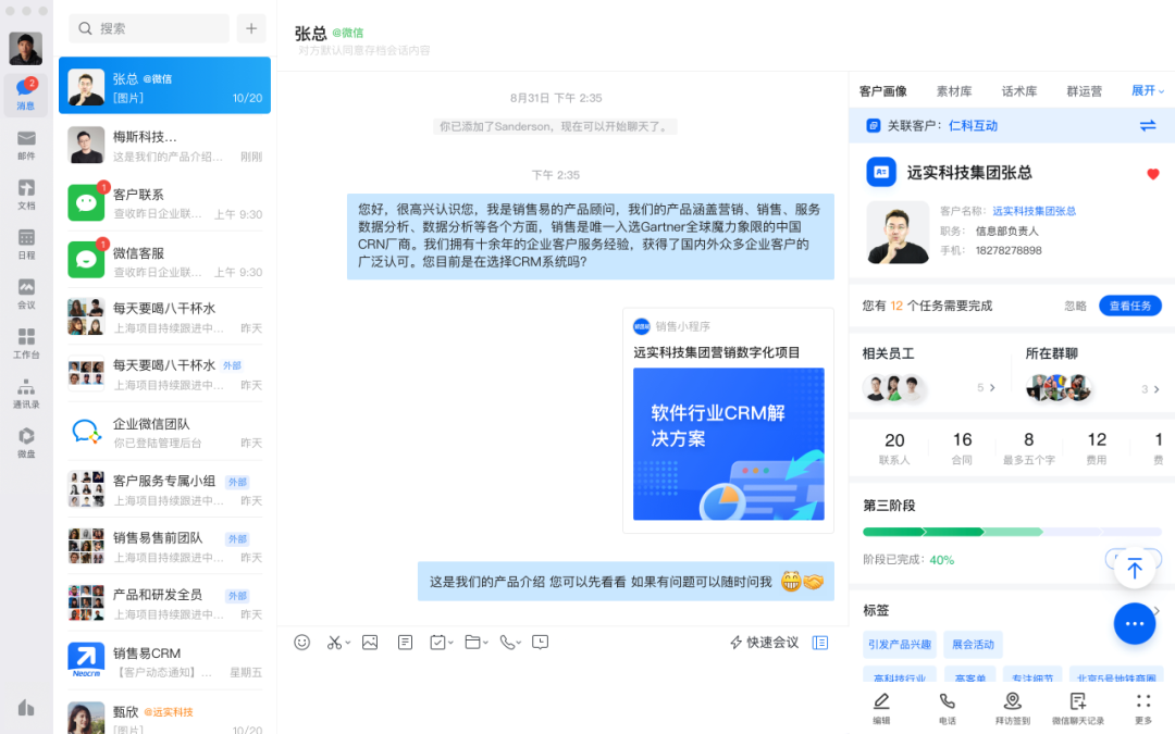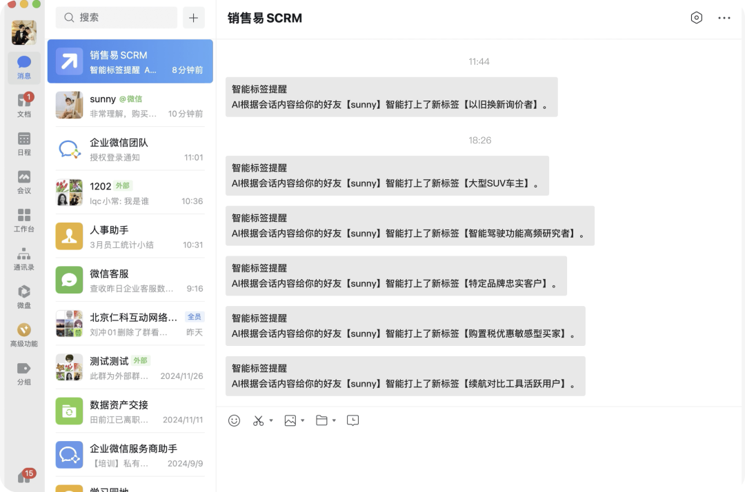 销售易CRM与企业微信深度融合后,让“客户洞察和客户经营”融入到日常沟通场景中。销售人员无需跳出聊天界面,可实时查看客户360信息,比如客户画像、标签、当前商机阶段等,销售人员每次沟通不仅有规则可循、有上下文可参考、还有素材和话术来帮忙。借助企微智能会话能力,系统还能智能梳理出会话摘要,识别潜在商机并打上标签,持续丰富客户画像与互动记录。由此,每一次交流,都能转化为可追溯、可复用的客户运营资产,帮助销售在日常与客户的沟通中及时捕捉增长机会。