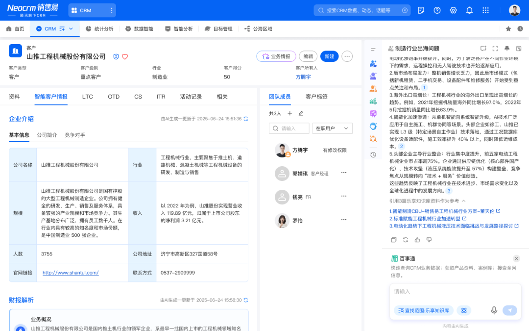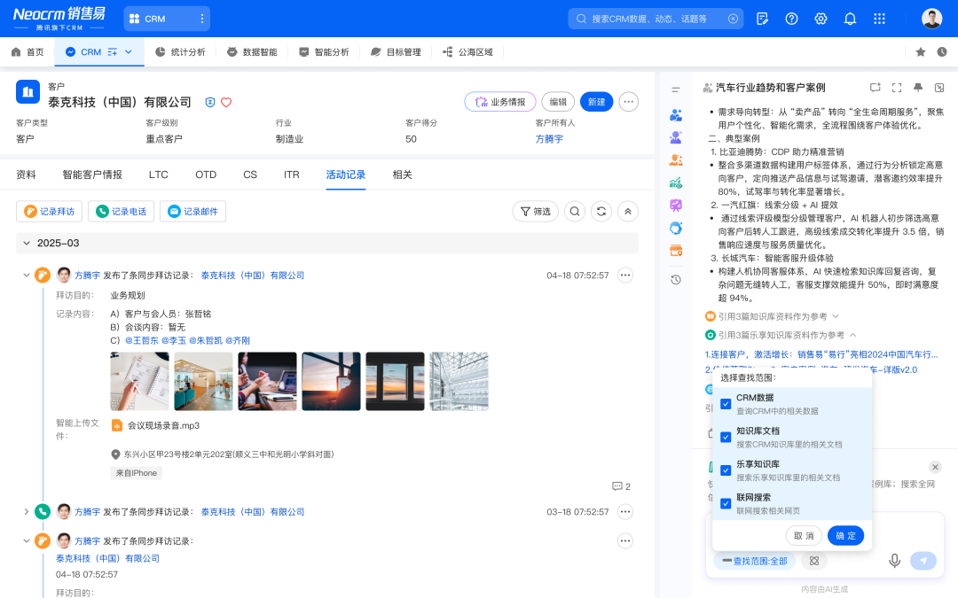 通过与腾讯乐享的集成,销售易CRM整合了腾讯乐享知识库、企业内部知识库、CRM数据与外部公开信息,并借助AI助手“百事通”统一入口,让知识获取和应用更加便捷。销售人员只需提出问题,AI即可调取多源信息,给出与业务语境高度匹配的答案,并将新知识持续沉淀回网络。在腾讯乐享的加持下,AI不再只是搜索工具,而是能够真正听懂业务语言、理解流程逻辑、赋能一线销售的智能伙伴。