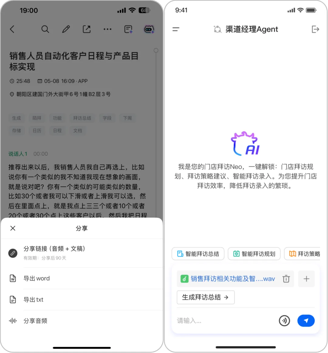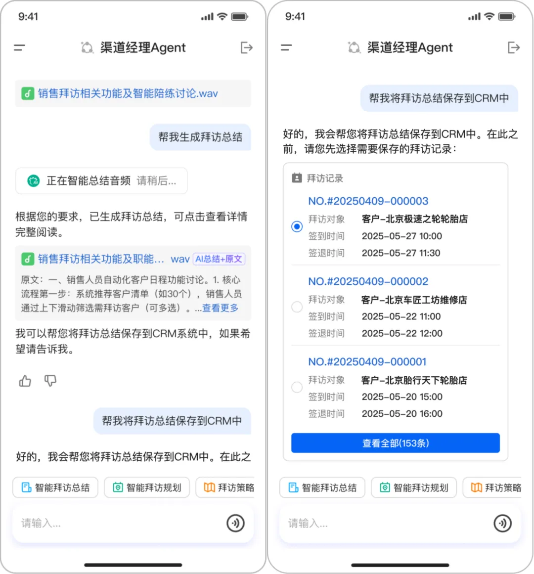 ● 拜访中—AI自动提取语音信息+智能回填,确保数据真实完整:渠道代表Agent可实时同步拜访录音,AI自动转写、提炼核心信息,生成规范完整的拜访记录,确保记录真实、细节无遗漏,为管理者掌握一线业务情况、做出科学决策提供可靠的数据支撑。