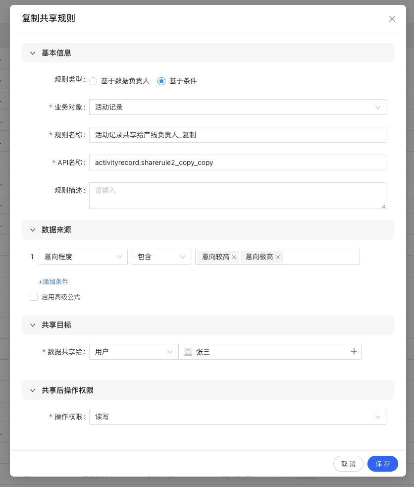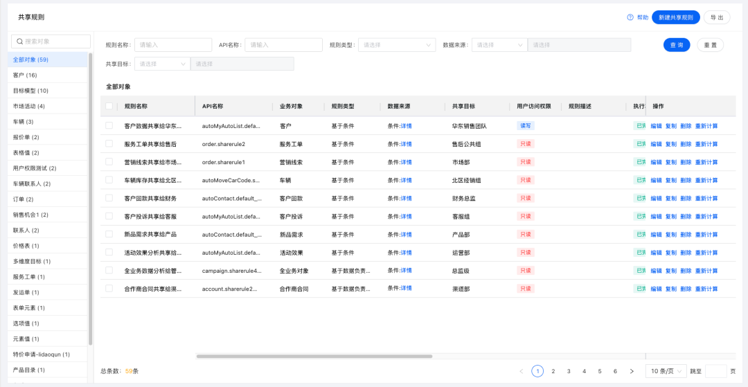 产品负责人能共享客户的活动记录做报表,市场部活动后可快速共享营销活动和潜在客户信息给SDR团队,企业组织架构调整时能批量改规则、查用户所属规则,售后客服能拿到销售关联的KA客户数据并提供专属服务;这些丰富的业务协作场景离不开共享规则的支持。