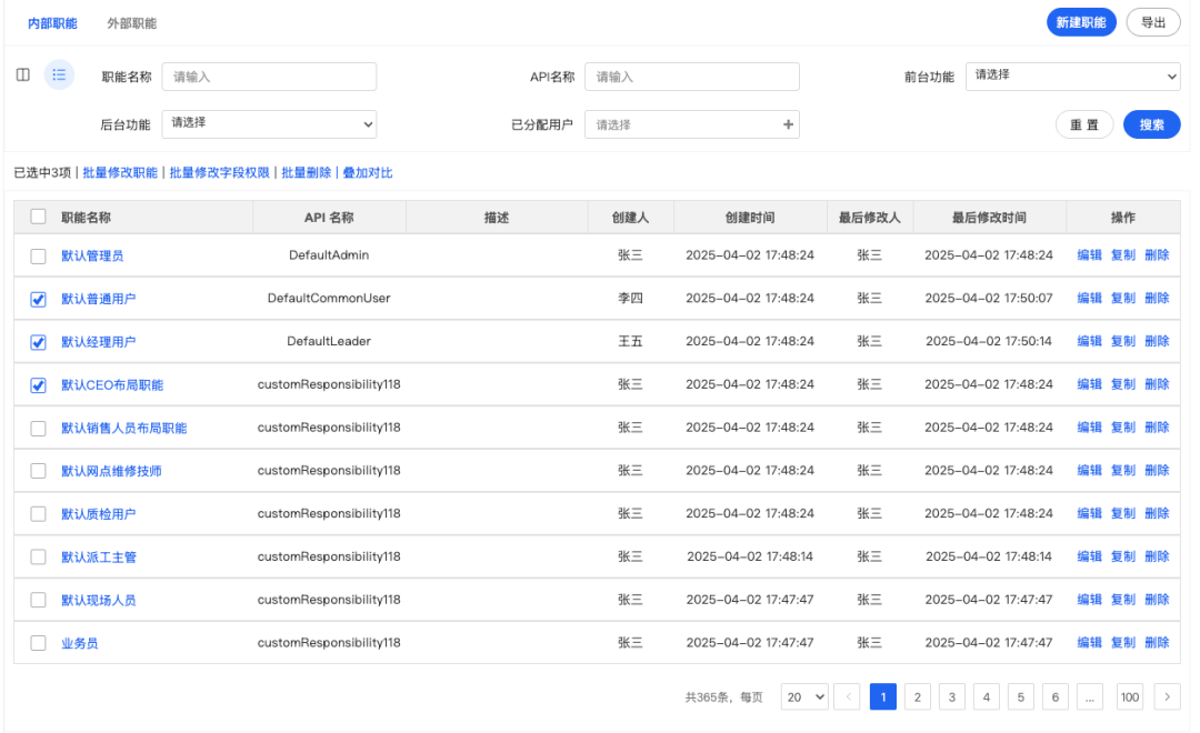 现在,管理员创建/复制职能时能一页聚合操作,一站式操作客户的功能、字段、布局;复制职能时,还可以自动复制相关详情页和表单的样式,不再需要重复手动调整;新建职能时,还可以一键清除冗余字段选项,防止职能变动后权限宽泛等问题。