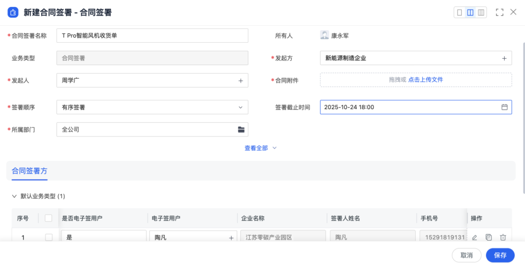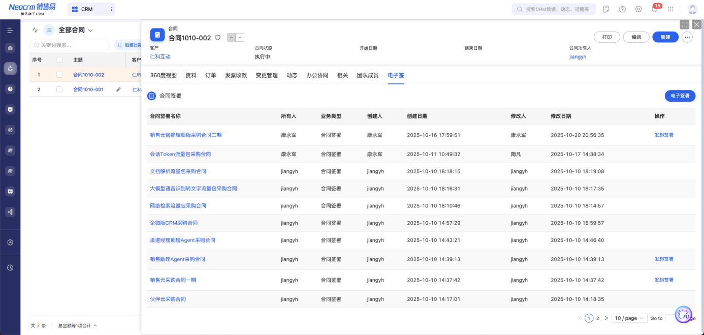 CRM内直接创建合同签署并发送相关签署方