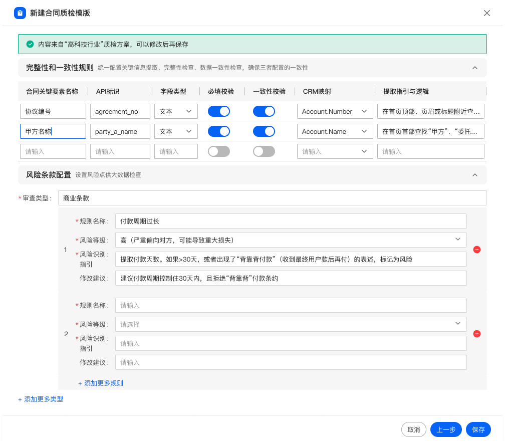 ● 完整性检查:AI基于企业自定义规则,核验CRM关键字段是否在合同中完整体现。