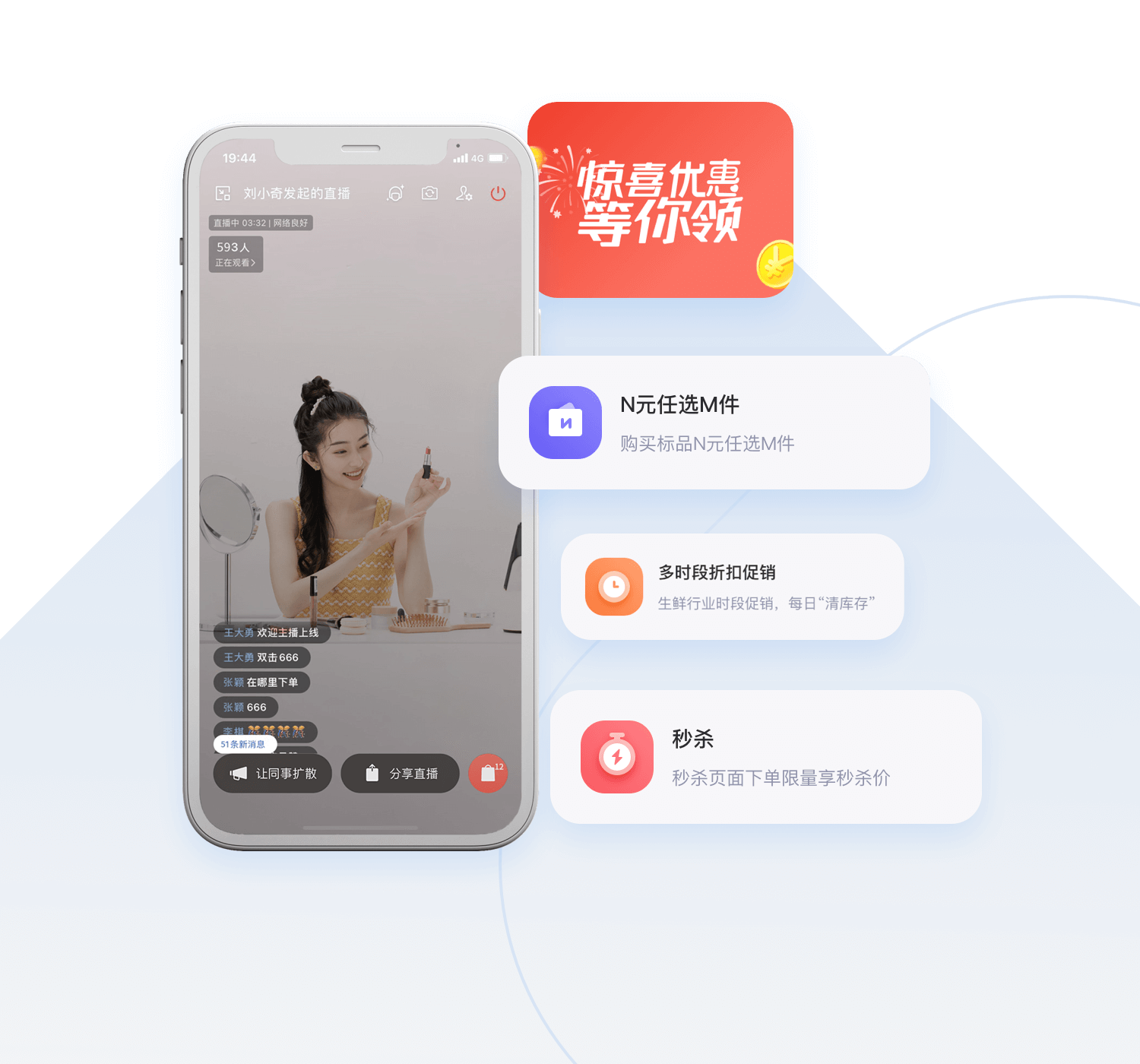 直播卖货,让员工从门店走到直播间,货品一键上下架,随时随地高效卖货,加速流量变现。