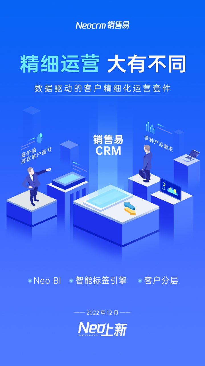 本月,销售易一次性推出三项最新升级的能力:Neo BI数据分析能力、智能标签引擎和客户分层能力,为企业开启微距视角,助力企业洞察数据背后的客户真实价值和需求趋势,为客户的精细化运营打下良好基础。快来免费试用吧!