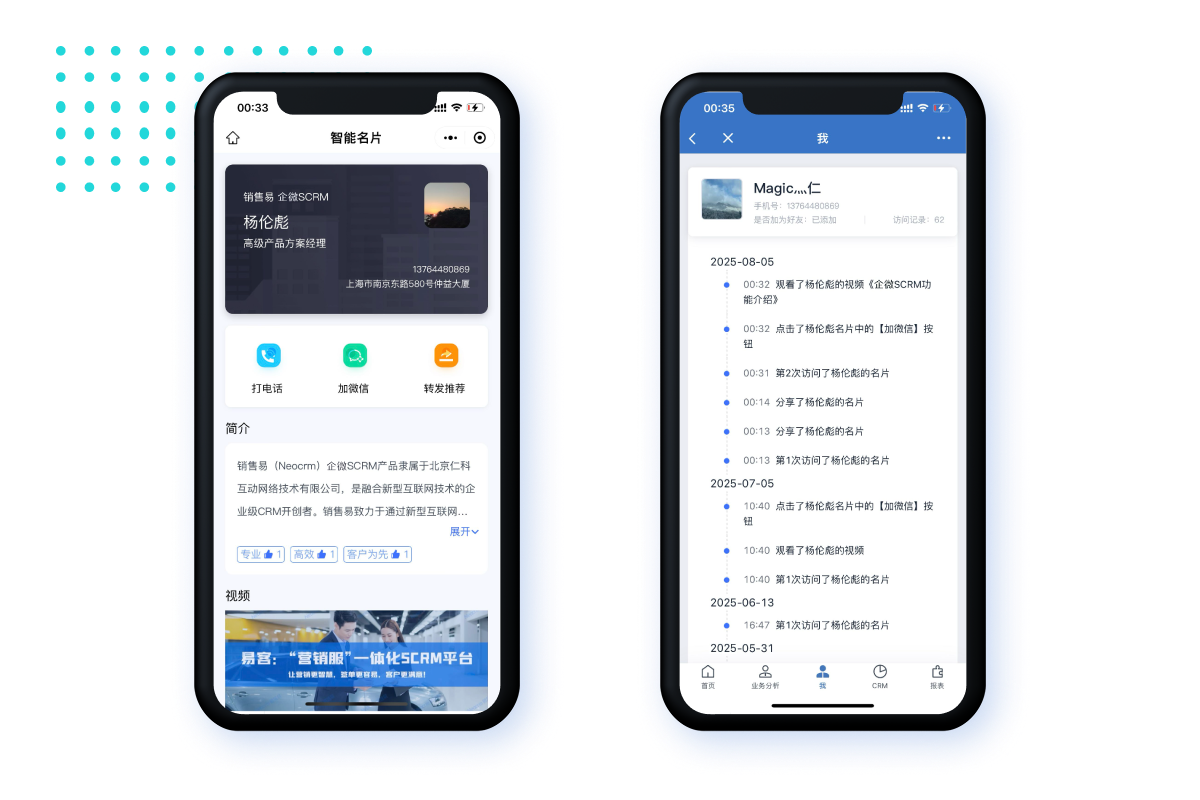 个性化展示企业及员工信息,扫码即可查看,系统自动记录客户访问轨迹,销售实时掌握客户意向,精准制定跟进策略