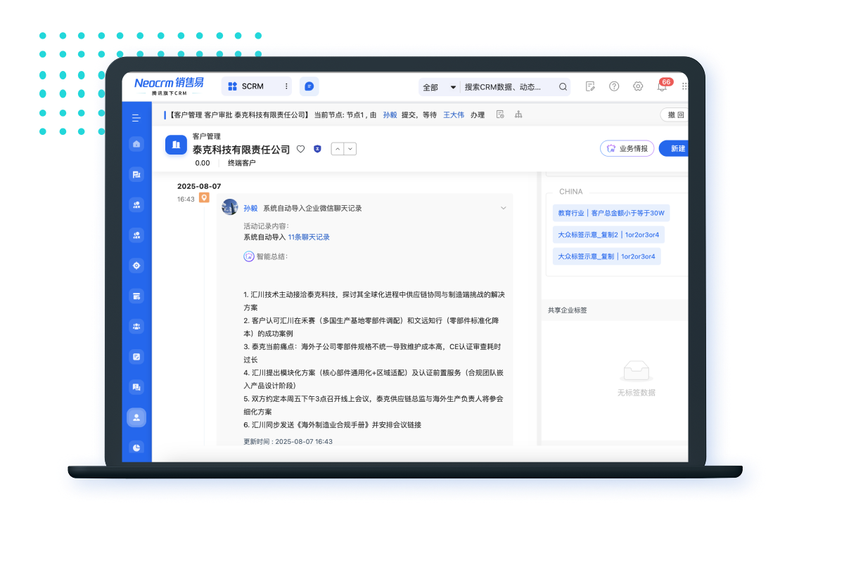 系统自动留存每日员工与客户沟通内容,生成结构化摘要,便于销售快速回顾、及时跟进